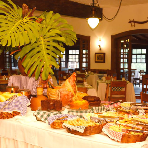O tradicional café da manhã mineiro, completo, com inúmeras opções de bolos e queijos. Ainda conta com mesa de frios, pão de queijo quentinho e frutas.
